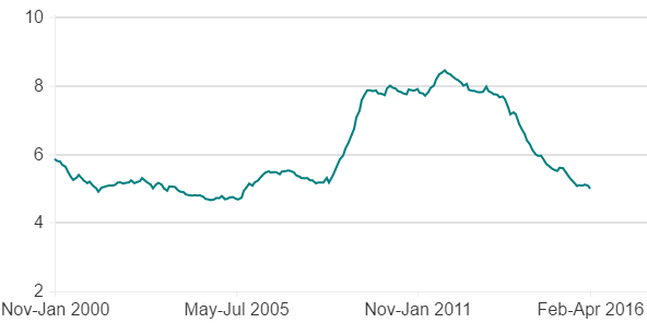 The UK unemployment rate has fallen to 5%, the lowest since October 2005, according to official figures. The BBC says unemployment total fell to 1.67 million in the February-to-April period, down 20,000 from the previous quarter, the Office for National Statistics (ONS) said. The number of people in work rose by 55,000, with the employment…